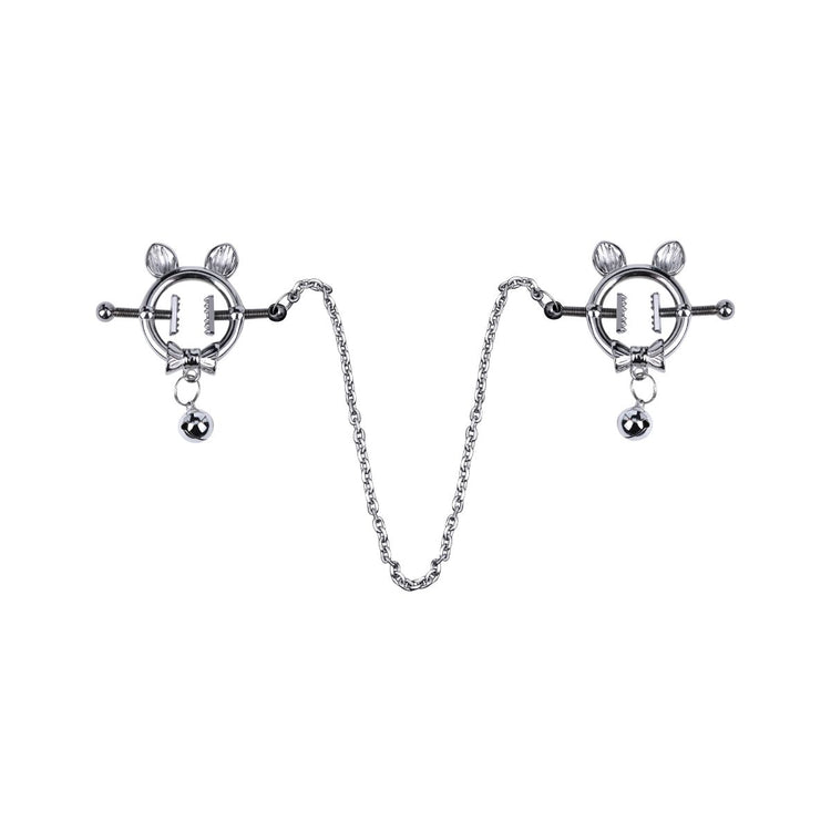 Realizzate in acciaio inossidabile, ogni pinza presenta orecchie di gatto, un dettaglio a papillon e un piccolo campanellino pendente. Il meccanismo a vite regolabile consente un controllo preciso della pressione, mentre le punte ruvide dell'impugnatura migliorano la stimolazione.